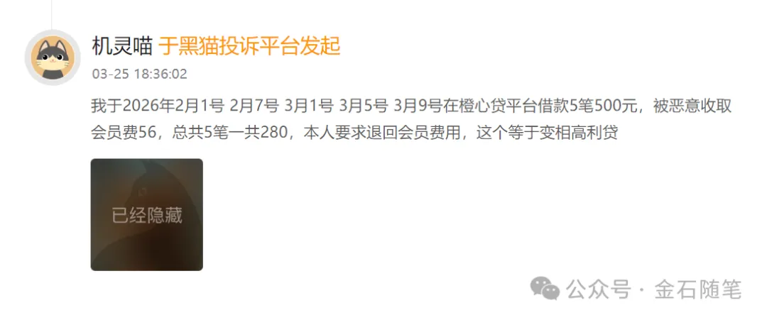 还有位用户更惨,2026年2月到3月,在橙心贷借款5笔500元借款,每笔都被收取56元非会员费,总共280元,2500元的借款实际到手只有2220元。可谓在助贷新规实施后收费依旧肆无忌惮,因为所谓会员费并无实质性服务,同样违法违规,且被用户指责为“变相高利贷”。