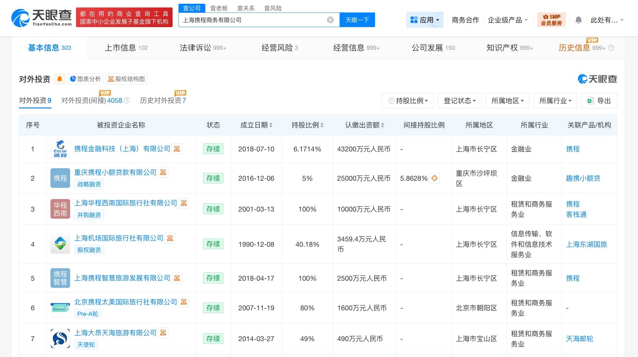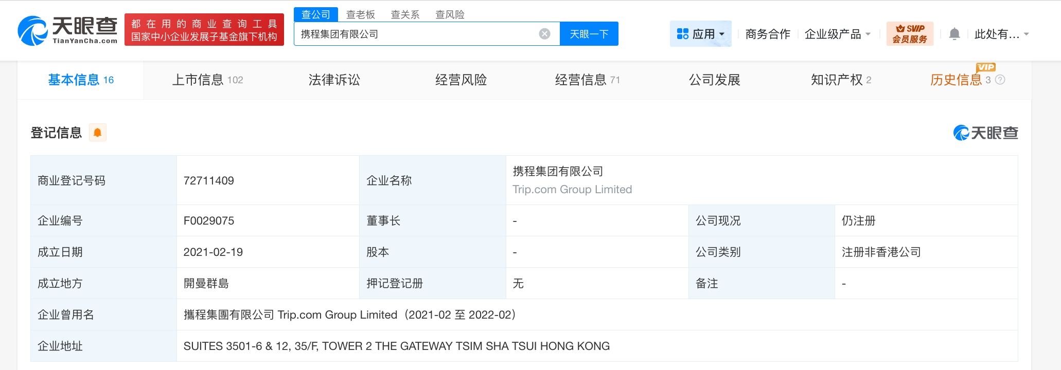 天眼查工商信息显示,携程集团有限公司于2021年2月成立于开曼群岛,公司类别为注册非香港公司。此外,携程集团在内地关联主体上海携程商务有限公司成立于2000年7月,法定代表人为孙波,注册资本9亿人民币,经营范围含互联网信息服务、会议及展览服务、信息咨询服务、酒店管理、餐饮管理等。股东信息显示,该公司由孙波、孙茂华共同持股。对外投资信息显示,该公司直接持股多家企业,包括携程金融科技(上海)有限公司、重庆携程小额贷款有限公司、上海机场国际旅行社有限公司等共同持股。此外,携程旗下还关联携程投资(上海)有限公司、携程计算机技术(上海)有限公司等多家公司。天眼风险信息显示,该公司现存多条法律诉讼信息,案由涉及不正当竞争纠纷、网络服务合同纠纷等。
