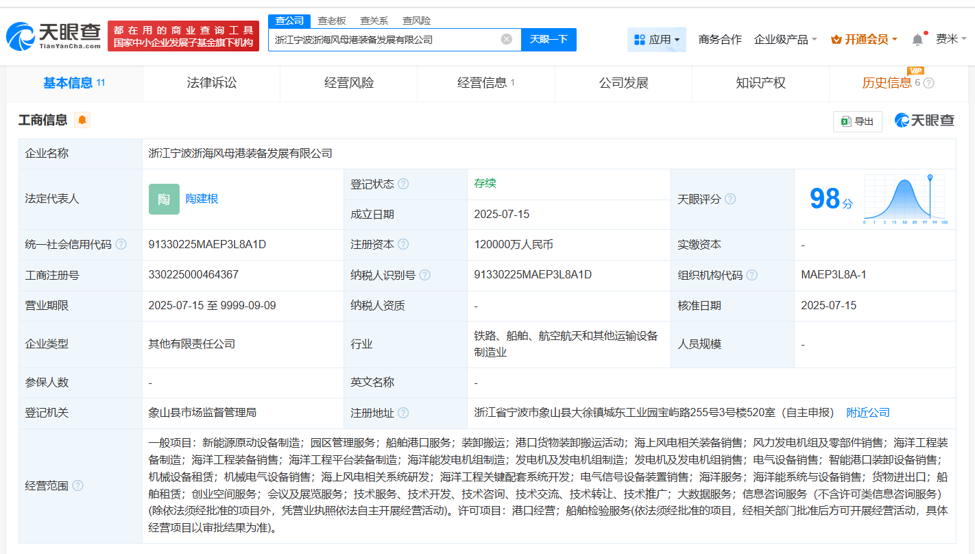 天眼查App显示,近日,浙江宁波浙海风母港装备发展有限公司成立,法定代表人为陶建根,注册资本12亿人民币,经营范围包括新能源原动设备制造、园区管理服务、船舶港口服务等,由浙江省海洋风电发展有限公司、宁波能源(600982)、日月股份(603218)、东方电缆(603606)共同持股。