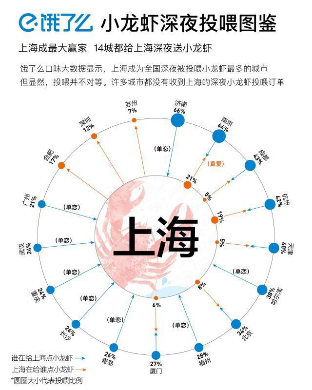 在深夜给异性点上一份小龙虾,既安抚了深夜里的胃,也传递着热辣辣的情。饿了么口碑数据显示,上海成为全国深夜“被投喂”小龙虾最多的城市,不知吃完还要进行垃圾分类的上海人是否领情,可全国各大城市的消费者就是爱“投喂”上海人。唯一有所不同的是福州,福州人深夜投喂小龙虾大多是给厦门人,或许厦门才是福州的真爱。除了上海最受欢迎外,深夜收到异性投喂小龙虾杭州人和北京人分别排名第二、第三。