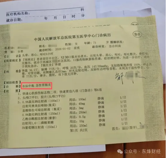 邹女士的家人起初误以为百合变质,送往社区医院救治,直至验血发现指标异常,才警觉可能为食物中毒。随后,家人从垃圾桶中找到剩余煮过的种球瓣,经拍照识别,确认其为水仙。二人随后被分别转至北京儿童医院和解放军307医院进行解毒治疗。