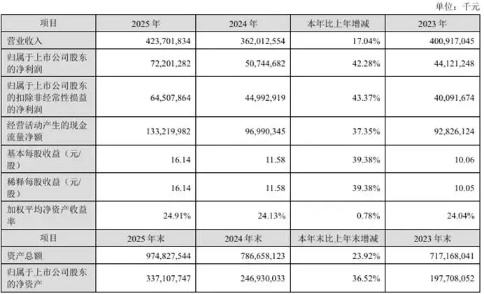 根据报告,宁德时代2025年总收入为4237.02亿元,同比增长17%;净利润为722亿元,增长42%。这成绩既刷新了自己历史上的纪录,还超过了国内13家上市汽车企业2025年利润总和。