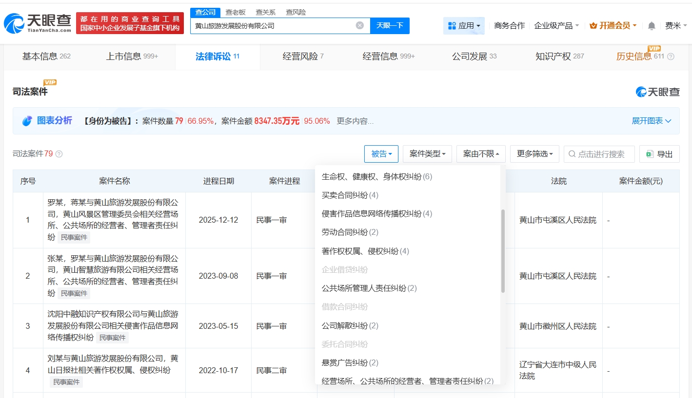 天眼查工商信息显示,涉事公司黄山旅游发展股份有限公司成立于1996年11月,法定代表人为章德辉,注册资本约7.3亿人民币,经营范围包括名胜风景区管理、游览景区管理、休闲观光活动等。股东信息显示,该公司由黄山旅游集团有限公司、王建成、香港中央结算有限公司等共同持股。天眼风险信息显示,该公司曾多次因经营场所、公共场所的经营者、管理者责任纠纷,生命权、健康权、身体权纠纷等被起诉。对外投资信息显示,该公司对外投资30余家企业,其中20余家企业处于存续状态,包括黄山赛富旅游文化产业发展基金(有限合伙)、黄山云巅投资管理有限公司、黄山云际置业有限公司等。