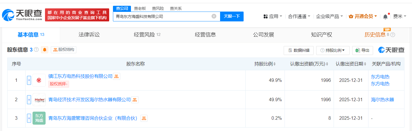 天眼查App显示,近日,青岛东方海盛科技有限公司成立,法定代表人为管江勇,注册资本4000万人民币,经营范围包括机械电气设备制造、机械电气设备销售、家用电器零配件销售、家用电器制造、家用电器销售、通用零部件制造等,由东方电热(300217)、海尔集团旗下青岛经济技术开发区海尔热水器有限公司、青岛东方海盛管理咨询合伙企业(有限合伙)共同持股。