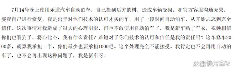 有车主在第三方平台投诉称,他在今年7月14号晚上使用乐道L60的自动泊车功能,然后直接撞在树上,后来车主向乐道反馈无果,乐道表示这是车主自己的责任,需要自己送修。