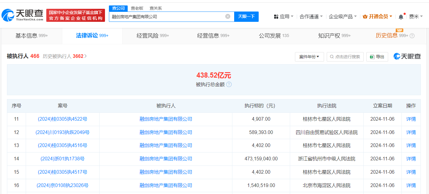 天眼查法律诉讼信息显示,11月6日和7日,融创房地产集团有限公司新增10余条被执行人和恢复执行信息,执行标的合计4.7亿余元,涉及票据纠纷等案件,部分案件被执行人还包括融创鑫恒投资集团有限公司、西双版纳国际旅游度假区开发有限公司等,执行法院包括浙江省杭州市中级人民法院、景洪市人民法院、昆明市呈贡区人民法院等。