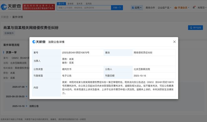 天眼查App显示,10月16日,因肖战与田某某网络侵权责任纠纷一案已审理终结,法院向田某某公告送达民事判决书。自公告之日起30日内来本院领取民事判决书,逾期则视为送达。