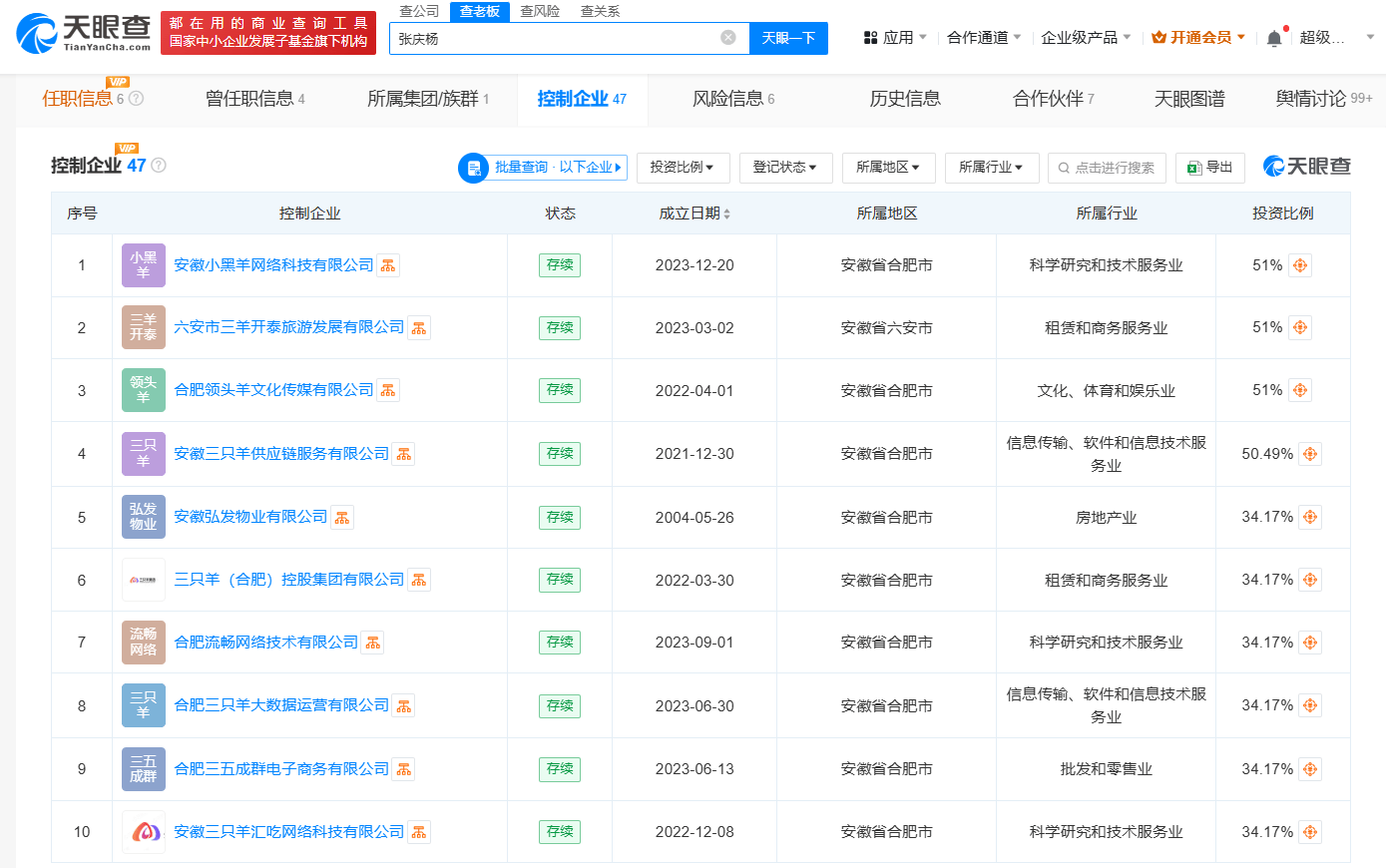 张庆杨(疯狂小杨哥)关联6家公司,其中3家为存续状态,包括三只羊(合肥)控股集团有限公司、合肥三只羊网络科技有限公司、合肥领头羊文化传媒有限公司。通过直接或间接持股,小杨哥拥有40余家企业的控制权,包括安徽三只羊供应链服务有限公司、六安市三羊开泰旅游发展有限公司、合肥三只羊教育科技有限公司、合肥三只羊助农科技有限公司等,版图涉及供应链、教育、农业、旅游等领域。
