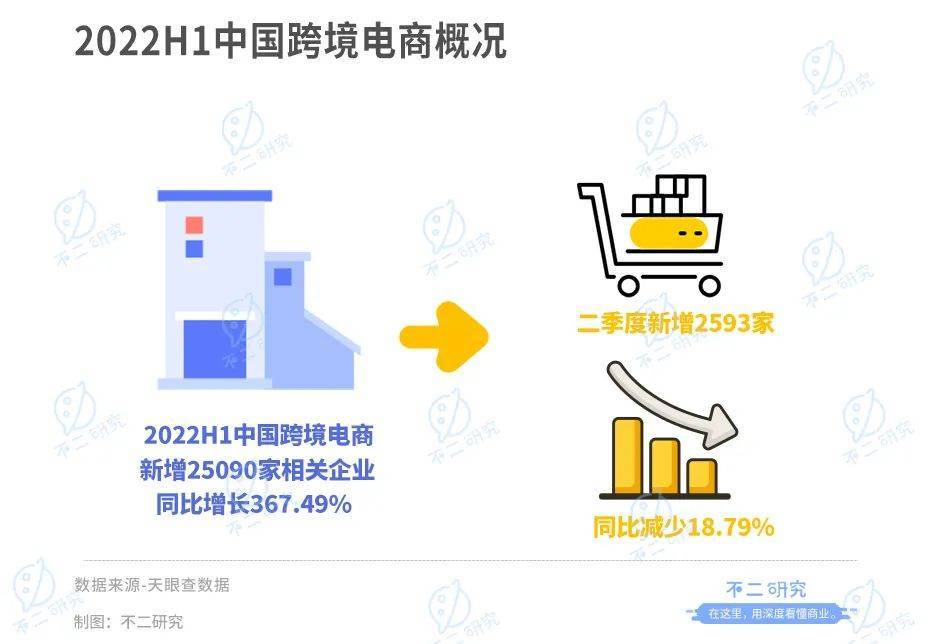 据天眼查数据显示,2022上半年全国共新增25090家跨境电商相关企业,同比增长367.49%。其中,二季度新增2593家,同比减少18.79%。