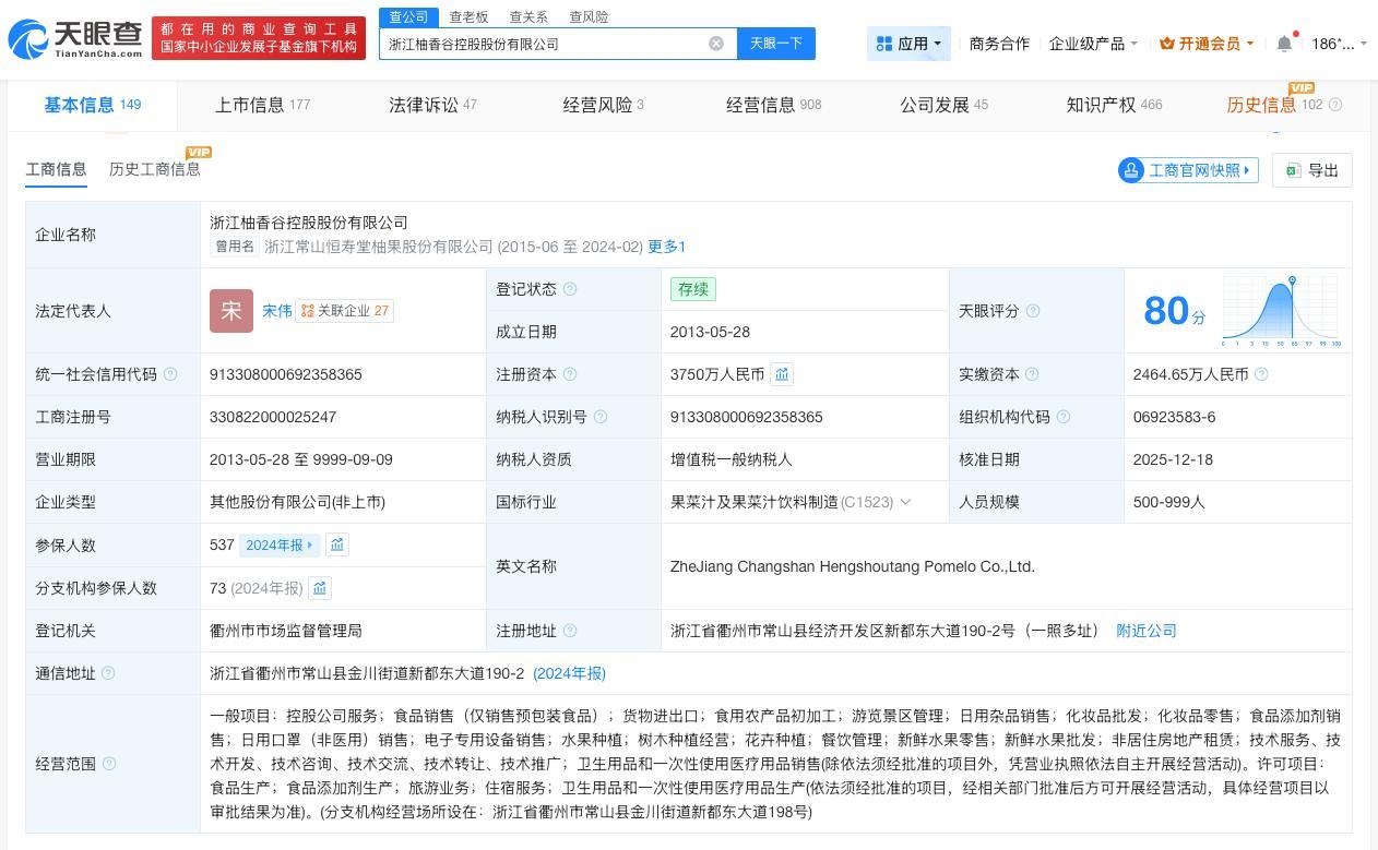 天眼查App显示,宋柚汁产品关联公司浙江柚香谷控股股份有限公司成立于2013年5月,法定代表人为宋伟,注册资本3750万人民币,经营范围包括控股公司服务、食品销售、货物进出口、食用农产品初加工等。股东信息显示,该公司由上海柚缘健康食品股份有限公司等共同持股。