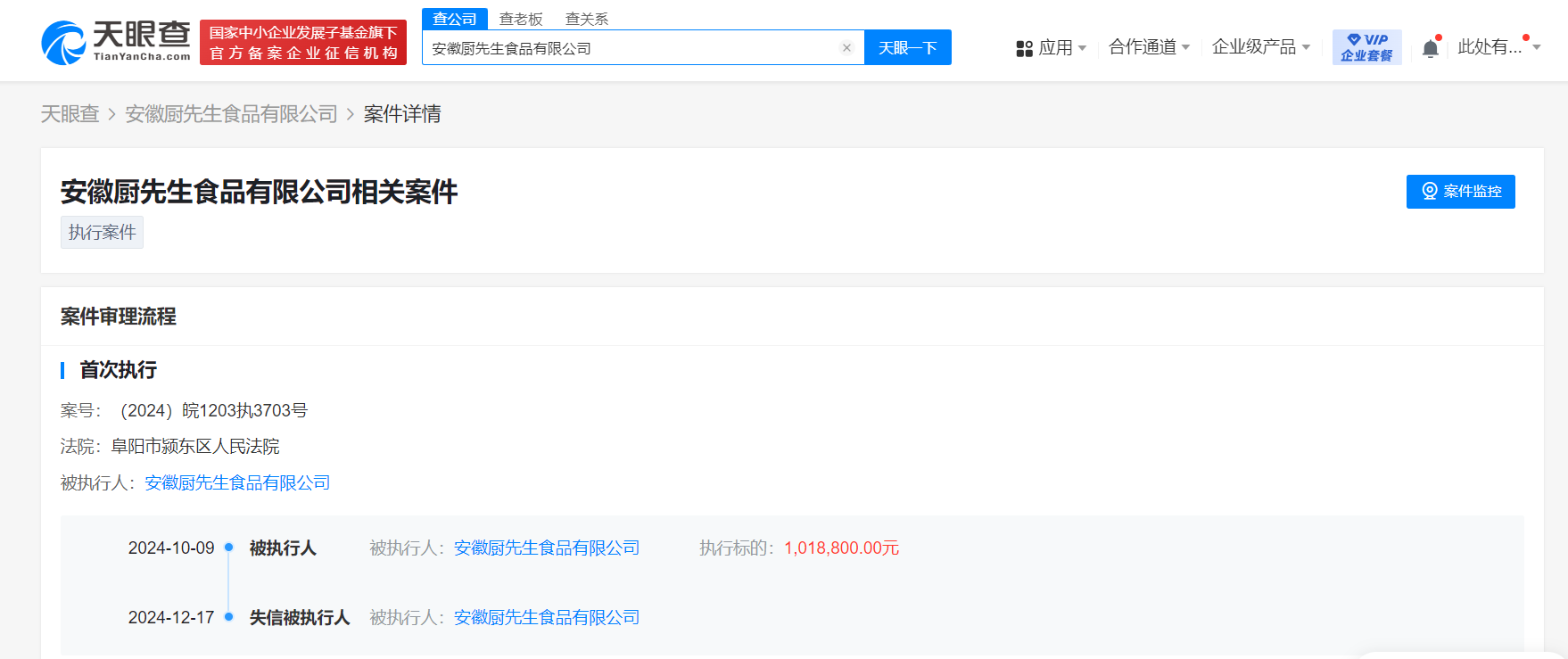 近日,因有履行能力而拒不履行生效法律文书确定义务,安徽厨先生食品有限公司被阜阳市颍东区人民法院列为失信被执行人(老赖),履行情况为全部未履行。案件流程信息显示,今年10月,该公司已因此案被强制执行101.88万元。