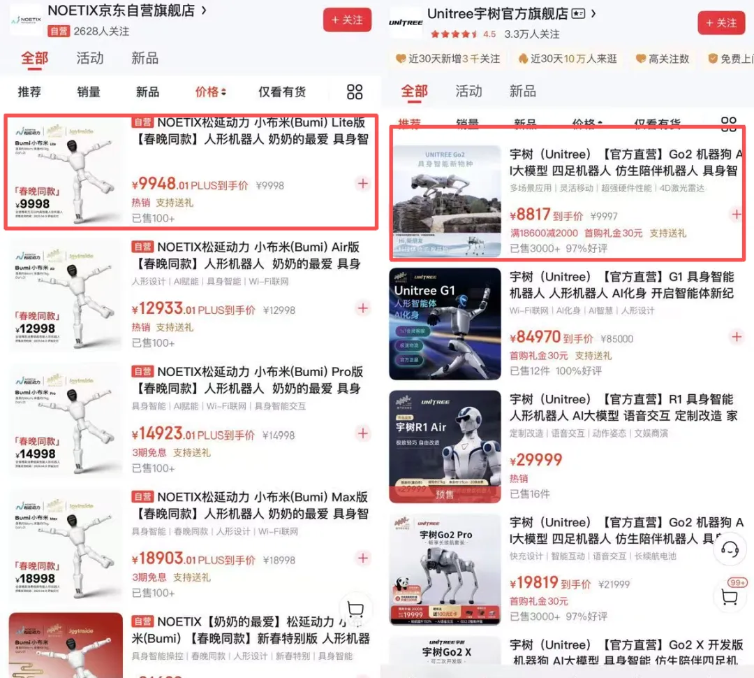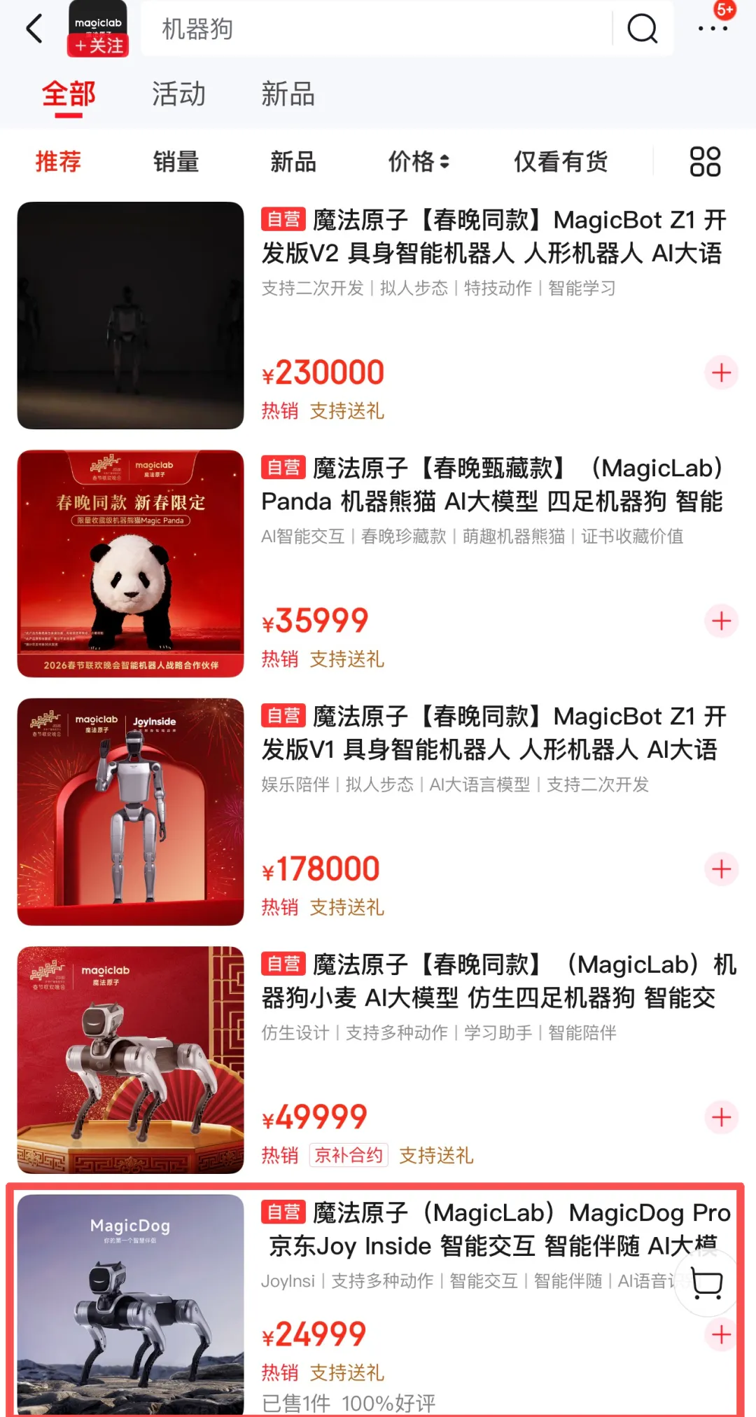 而价格上,也并不便宜。目前来看,松延动力的小布米机器人和宇树的机器狗都有万元以下的产品,而魔法原子最便宜的机器狗产品,价格也要24999元。