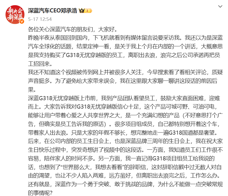 5月中旬,有媒体曝光深蓝汽车内部讲话。讲话中,邓承浩表示,如果员工购买了G318无忧穿越版,可以获得两个月离职机会。旅行结束后,公司承诺员工可以回来继续工作。