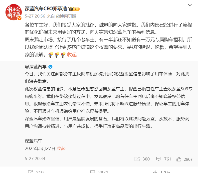 邓承浩也随之跟进致歉,并承认这次往车机推送购车优惠回馈老车主,是他的主意,“走访市场发现半数老车主不知福利,要求团队加强触达,是我的错误。”