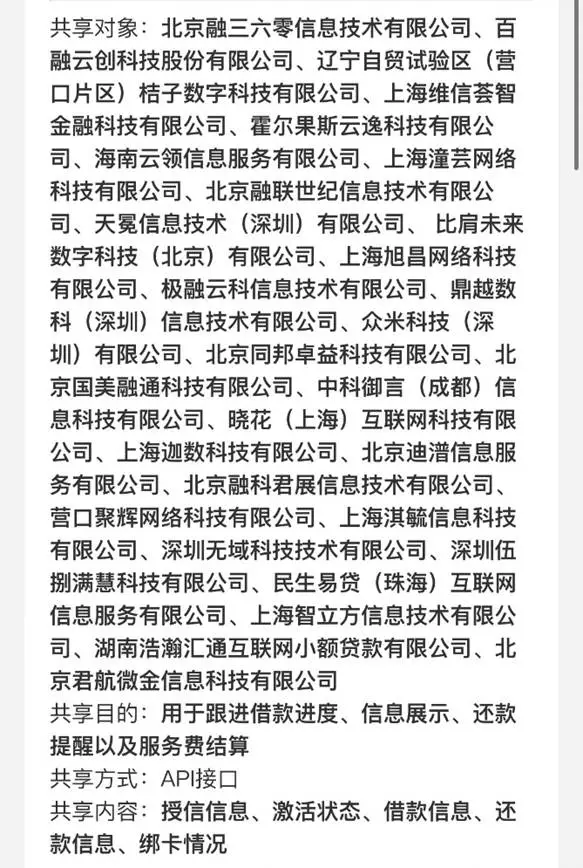 新黄河记者注意到,易花花平台将用户的信息共享给多个第三方,其中不仅包括资金机构无锡锡商银行、担保服务机构陕西钧信恒益融资担保有限责任公司,还包含多家第三方助贷平台。