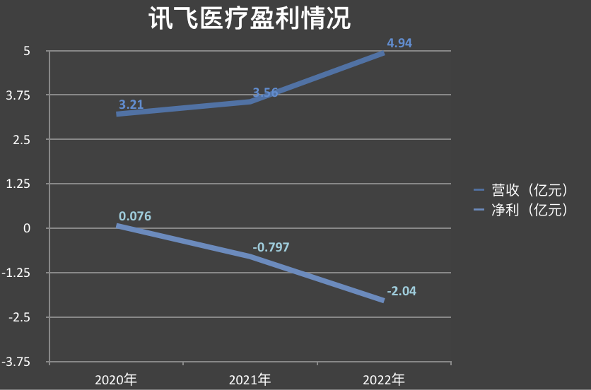 讯飞医疗当然也不例外。依照披露的数据,讯飞医疗的亏损在不断扩大。据分拆预案,2020年、2021年和2022年,讯飞医疗实现营收3.21亿元、3.56亿元和4.94亿元;实现净利润分别为761.39万元、-7973.23万元和-2.04亿元。