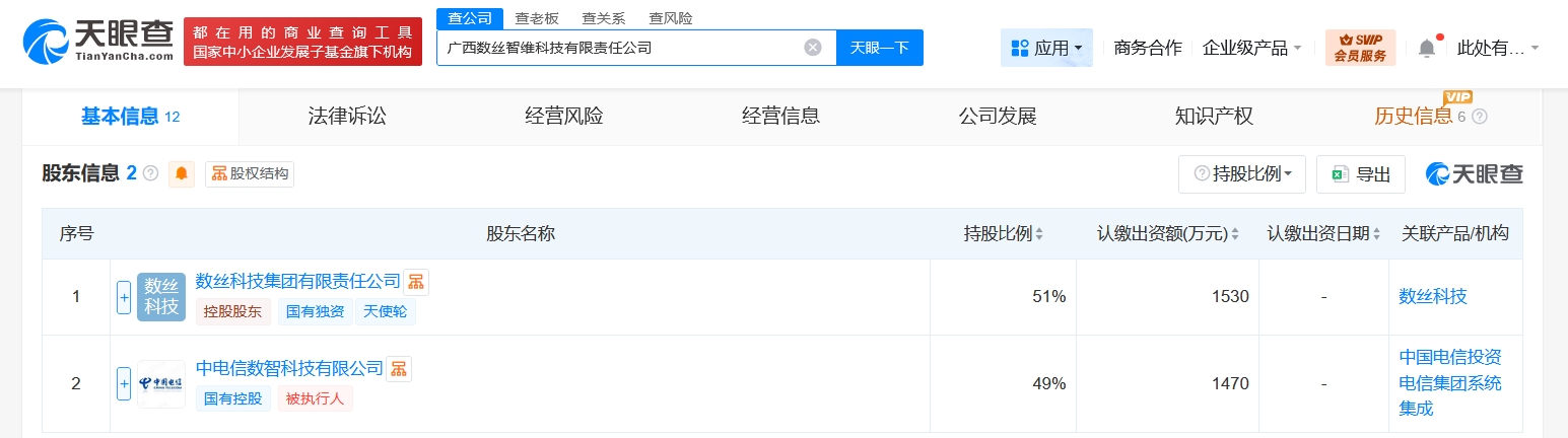 天眼查App显示,近日,广西数丝智维科技有限责任公司成立,法定代表人为姜家恒,注册资本3000万人民币,经营范围含软件开发、信息系统运行维护服务、信息系统集成服务、大数据服务、互联网数据服务、数据处理和存储支持服务、数据处理服务、人工智能应用软件开发、人工智能公共服务平台技术咨询服务、网络与信息安全软件开发、5G通信技术服务等。股东信息显示,该公司由数丝科技集团有限责任公司、中国电信旗下中电信数智科技有限公司分别持股51%、49%。
