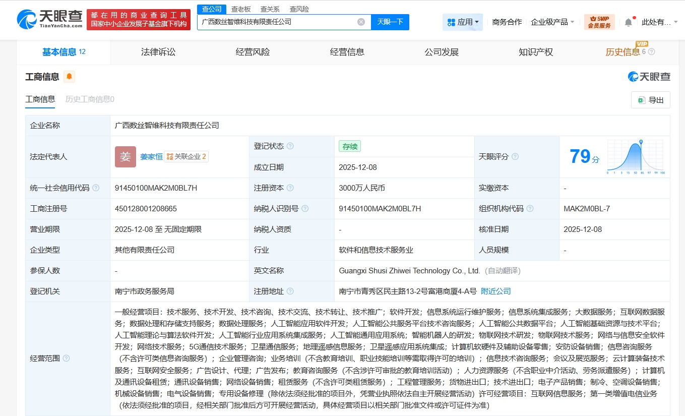 近日,广西数丝智维科技有限责任公司成立,法定代表人为姜家恒,注册资本3000万人民币,经营范围含软件开发、信息系统运行维护服务、信息系统集成服务、大数据服务、互联网数据服务、数据处理和存储支持服务、数据处理服务、人工智能应用软件开发、人工智能公共服务平台技术咨询服务、网络与信息安全软件开发、5G通信技术服务等。