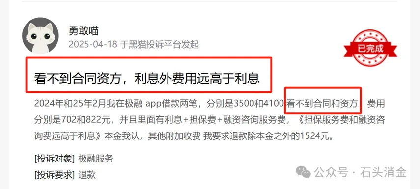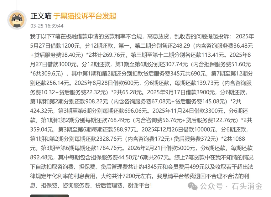 3月25日,有客户在黑猫投诉平台投诉在极融借款申请的贷款利率不合规、高息放贷、乱收费。根据借款人反馈,2025年5月至2026年2月期间在该平台借款7笔,合计本金27,000元,实际还款总额达32,187.32元,多出5,187.32元。经逐笔以内部收益率(IRR)方式核算,7笔贷款的实际年化利率分别为117.6%、188.4%、157.7%、203.6%、211.0%、193.0%和71.5%,其中6笔超过100%,最高达211%,远超法律规定的年化36%上限。上述费用在借款人不知情的情况下自动扣取,仅各类服务费合计约4,345元,另含会员费499元。由此可知,