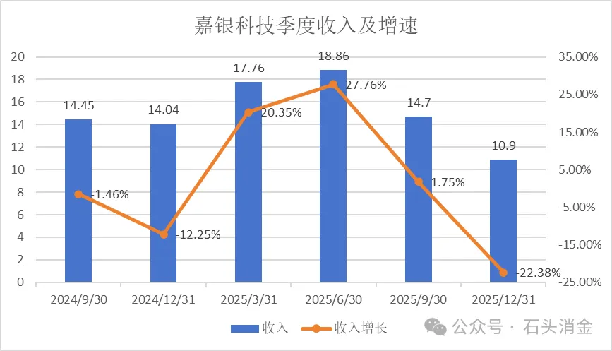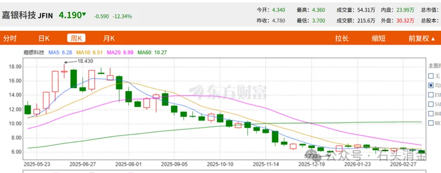 回溯2025年6月,嘉银科技股价还站在18.4美元的历史高点,风光无限。然而短短9个月后,截至2026年3月31日收盘,股价累计跌幅高达78%。这意味着,在不到一年的时间里,这家纳斯达克上市公司的市值蒸发了近八成。