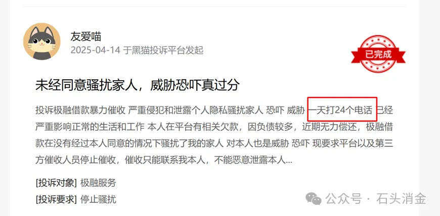暴力催收也是客户投诉的又一重要问题。有客户反馈:“极融借贷平台在未经本人同意的情况下,爆我通信录,打电话给我亲戚朋友,透露我个人贷款信息。”另一客户反馈:“极融借款委托第三方催收恐怖威胁本人,并骚扰家人,冒充国家公共机关”。还有客户投诉反馈:“极融借款将其名下的债权转让第三方(南京卓骏逸投资管理有限公司):该公司疑似找催收团队暴力催收,每日骚扰电话超过5次,并持续拨打工作单位法人电话,威胁发借款合同到公司邮箱;跟平台相关人员已在沟通协商的情况下,催收还是一直威胁恐吓。”还有客户反馈,每天被催收24次。