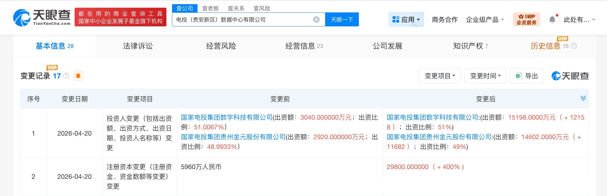 天眼查App显示,近日,电投(贵安新区)数据中心有限公司发生工商变更,注册资本由5960万人民币增至2.98亿人民币,增幅400%。