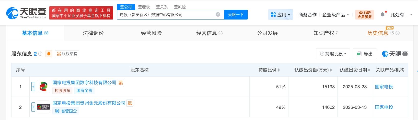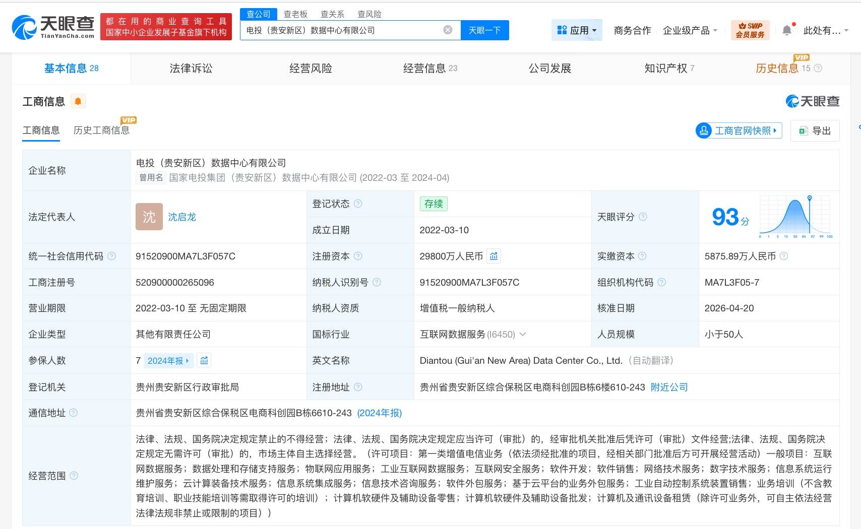 该公司成立于2022年3月,法定代表人为沈启龙,经营范围包括互联网数据服务、数据处理和存储支持服务、物联网应用服务、工业互联网数据服务等,由国家电投集团数字科技有限公司、国家电投集团贵州金元股份有限公司共同持股。