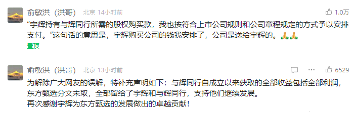俞敏洪也通过公众号“老俞闲话”披露:“经东方甄选董事会讨论同意,不管与辉同行公司经营如何,都给予宇辉有吸引力的保底收入(现金 + 股权),以示对宇辉价值的肯定…… 同时我承诺,除了可以得到全部保底收入外,如果与辉同行有收益,宇辉可以继续得到公司净利润的一半分配。”