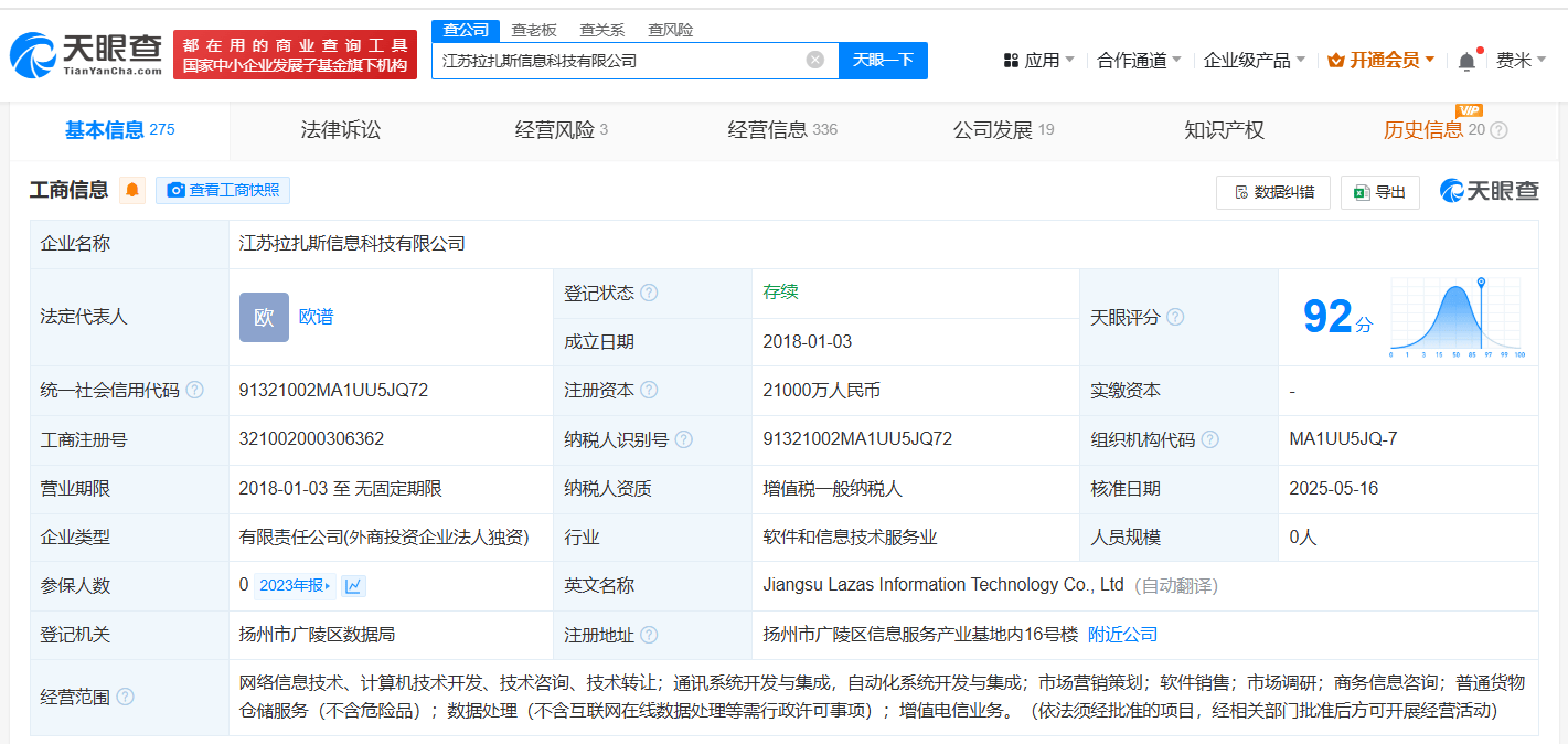 天眼查App显示,近日,江苏拉扎斯信息科技有限公司发生工商变更,注册资本由1000万人民币增至2.1亿人民币,增幅2000%。