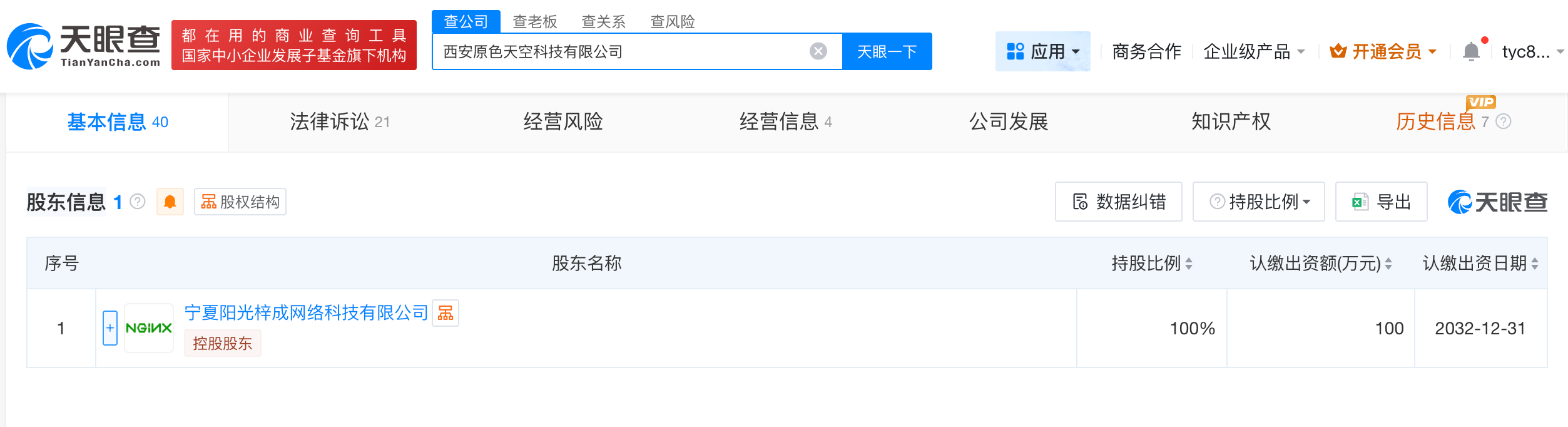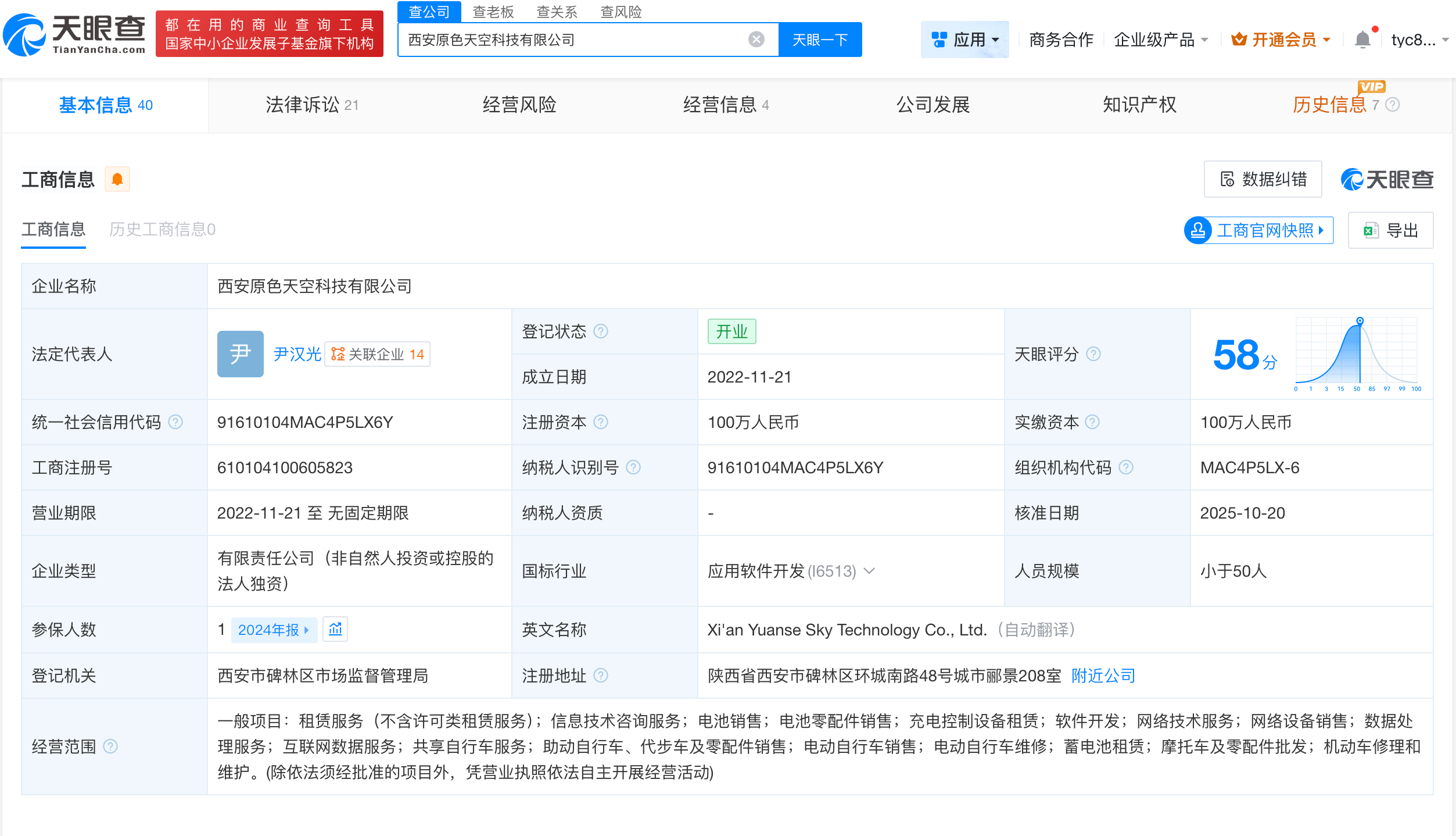 天眼查App显示,天空出行关联公司西安原色天空科技有限公司成立于2022年11月,法定代表人为尹汉光,注册资本100万人民币,经营范围包括租赁服务、信息技术咨询服务、电池销售等,由宁夏阳光梓成网络科技有限公司全资持股。参保人数信息显示,该公司2024年参保人数为1人。