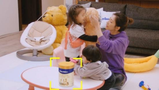实际上,在前几年,人工智能一词还算新鲜的时候,芒果TV的爆款综艺《爸爸去哪儿》里,就已经出现了AI广告植入。例如下图中出现的舒肤佳洗手液和诺优能牛奶,都不是真实物件摆放,而是后期特效技术智能植入。