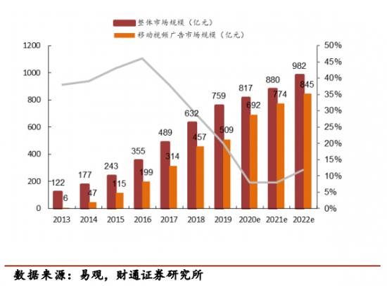 据“财通证券”整理的数据,2019年中国在线视频广告整体规模759亿,其中移动视频广告509亿元,占比在67%。而根据预测值,2021年中国在线视频广告整体规模将达到880亿元,其中移动视频广告774亿元,占比将上浮至87%。