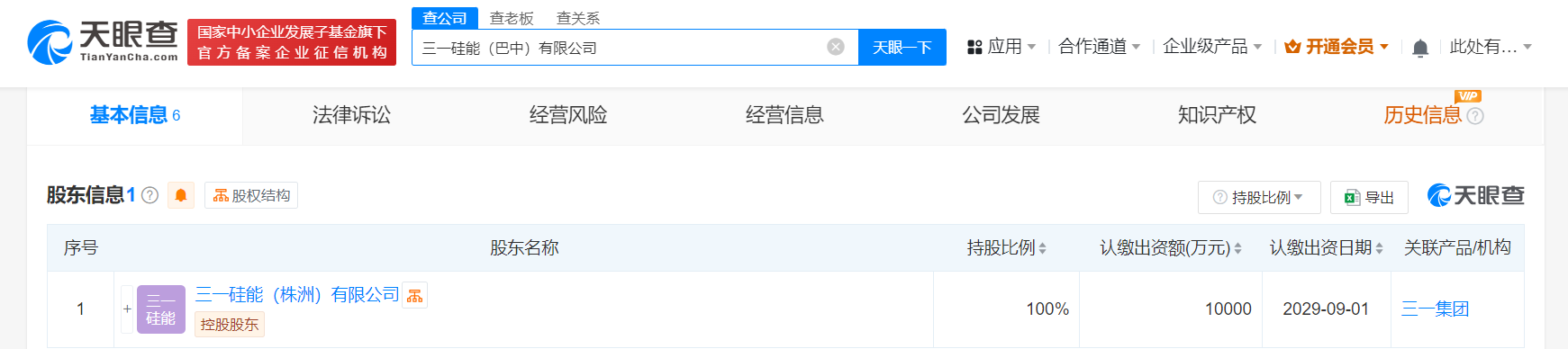 天眼查App显示,近日,三一硅能(巴中)有限公司成立,法定代表人为代晴华,注册资本1亿人民币,经营范围含半导体器件专用设备制造、半导体分立器件制造、电力电子元器件制造、电子元器件批发、电子专用材料研发、光伏设备及元器件制造等。股东信息显示,该公司由三一集团旗下三一硅能(株洲)有限公司全资持股。