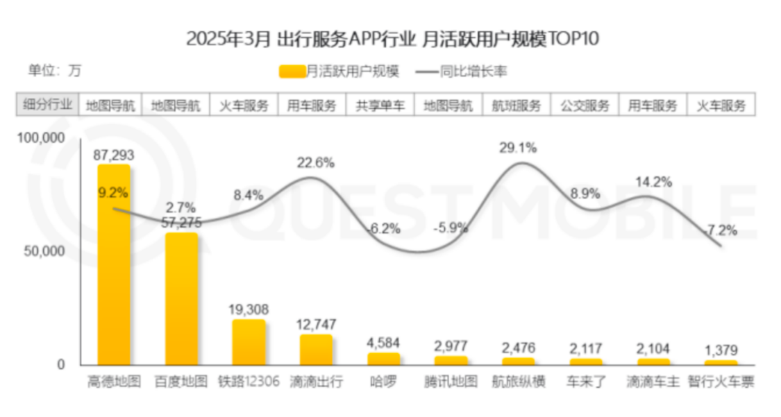 QuestMobile数据显示,截至2025年3月,高德地图以8.73亿月活用户领跑出行服务APP,而百度地图月活用户为5.73亿,差距显著。自2014年被阿里巴巴全资收购后,高德地图虽持续投入研发,但直至2025年才首次实现盈利,可见整个行业盈利压力巨大。