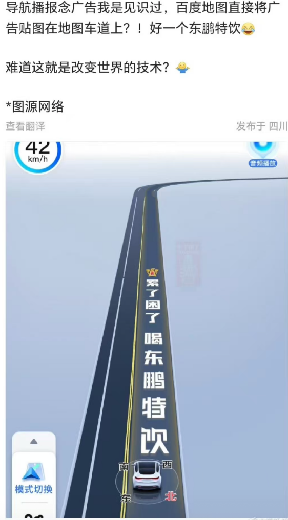 近日,有网友反映,在使用百度地图查看路线时,屏幕上竟出现了“累了困了,喝东鹏特饮”的广告语,甚至还有虚拟广告牌的图像。这种做法迅速在网络上掀起轩然大波。