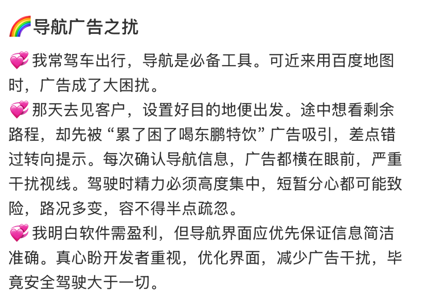 公众的质疑直指本质:导航工具应以用户安全为基石,还是可沦为商业广告的载体?当技术不再纯粹服务于人,而是将用户视为流量变现的“数据肉身”,其向善的边界究竟何在?正如网友呼吁:“盼开发者优化界面,减少干扰,毕竟安全驾驶大于一切。”