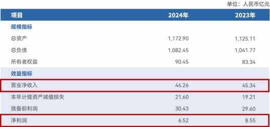 其次,盈利模式持续承压。2024年,百信银行营收仅增长2.02%至46.26亿元,净利润却同比下滑23.72%至6.52亿元,终结了此前三年的高速增长。