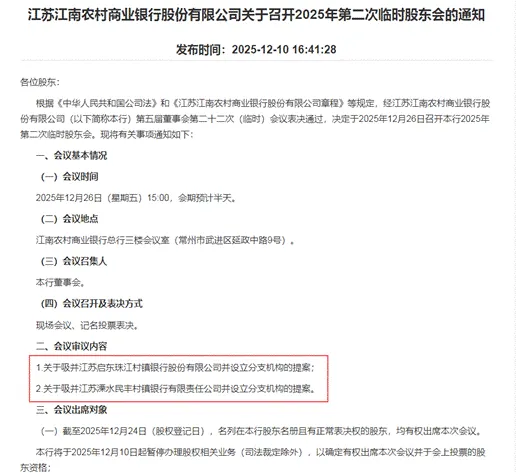 2025年底,江南农商行迎来了一个重要战略转折点。12月,其2025年第二次临时股东大会,审议通过了吸收合并江苏启东珠江村镇银行和江苏溧水民丰村镇银行的议案。