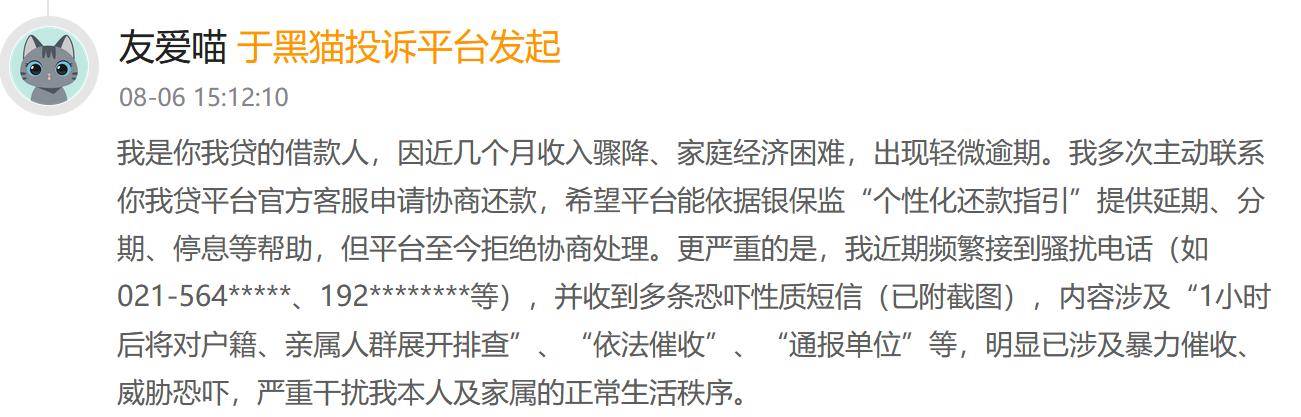 嘉银科技的催收策略也引发了广泛的争议。为了追求低逾期率,公司采取了激进的催收手段。客服明确要求用户“需逾期后再协商”,但逾期后,催收手段却被用户投诉为侵扰性极强。黑猫投诉平台上,用户纷纷反映遭遇了暴力催收、电话骚扰亲友等恶劣行为。这些行为不仅严重干扰了用户的正常生活,更与平台“文明催收”的承诺形成了鲜明的反差。