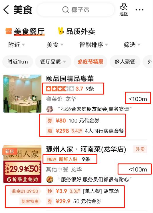 这同样决定了呈现的内容并不是【近期反馈且近距离】的,尤其是当我搜索商圈时,能够出来的匹配性结果非常有限,只有当你的内容中带有这一商圈的名字才会提高被前排推送的概率。