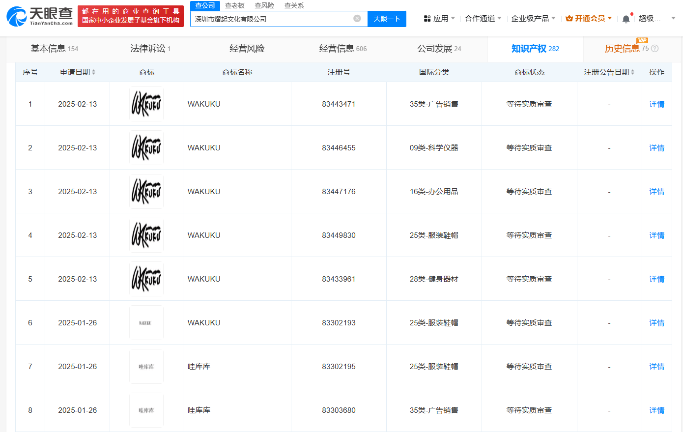 天眼查App显示,深圳市熠起文化有限公司已申请注册多枚“WAKUKU”“哇库库”商标,国际分类涉及广告销售、网站服务、服装鞋帽等,当前商标状态为等待实质审查。