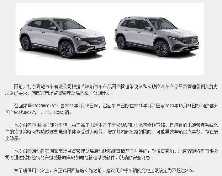早在今年3月份,一则召回计划显示,彼时宣布要召回的12308辆EQA和EQB,原因是“由于高压电池生产工艺波动导致电池可靠性下降,且现有的电池管理系统软件的控制策略可能造成这些电池单体承受过大载荷,增加其内部短路的风险,可能导致车辆起火事故,存在安全隐患”。