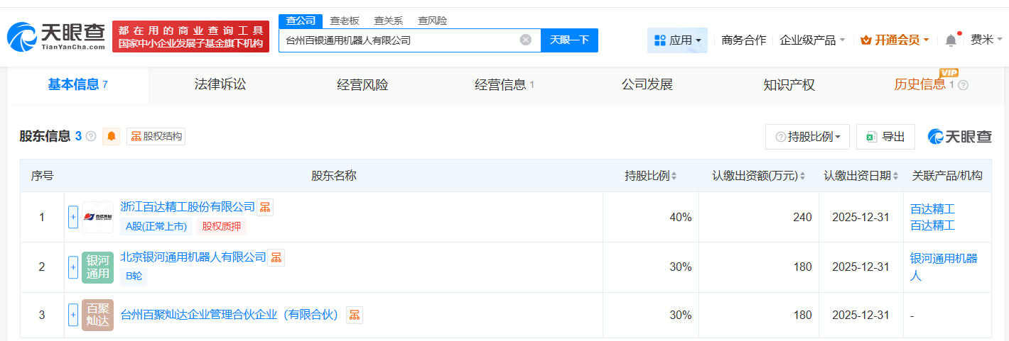 天眼查App显示,近日,台州百银通用机器人有限公司成立,法定代表人为张启斌,注册资本600万人民币,经营范围包括工业机器人制造、工业机器人销售、服务消费机器人制造等,由百达精工(603331)、北京银河通用机器人有限公司、台州百聚灿达企业管理合伙企业(有限合伙)共同持股。