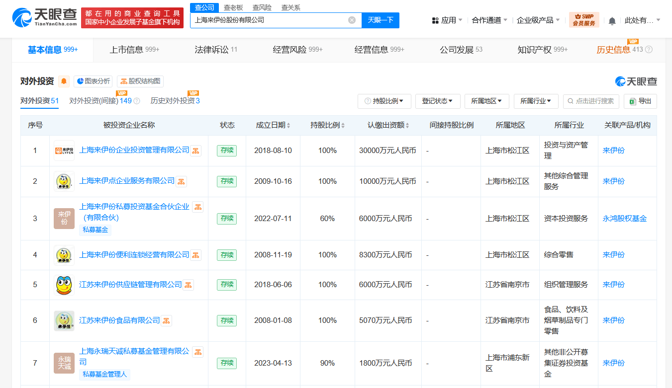 天眼查App显示,上海来伊份股份有限公司成立于2002年7月,法定代表人为郁瑞芬,注册资本约3.37亿人民币,经营范围含食用农产品批发、食用农产品零售、日用品销售、工艺美术品及礼仪用品销售、电子产品销售等,由上海爱屋企业管理有限公司、郁瑞芬、汪小明、上海海永德于管理咨询合伙企业(有限合伙)等共同持股。对外投资信息显示,该公司直接持股50余家公司,其中38家为存续状态,包括上海来伊份企业投资管理有限公司、上海来伊点企业服务有限公司、上海来伊份私募投资基金合伙企业(有限合伙)等,版图涉及消费、金融、文化传媒等。分支机构信息显示,该公司30余家分支机构已注销。