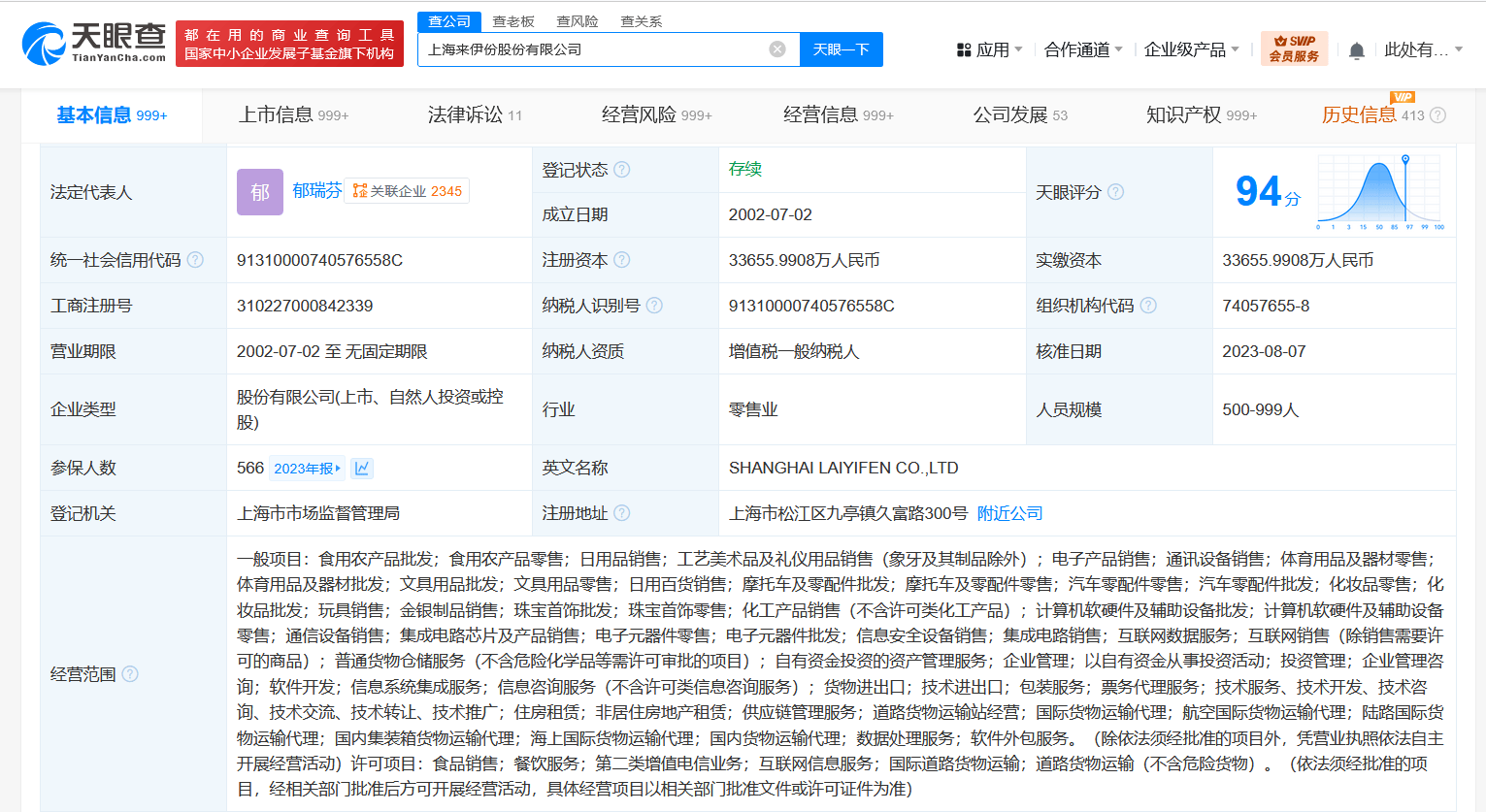天眼查App显示,上海来伊份股份有限公司成立于2002年7月,法定代表人为郁瑞芬,注册资本约3.37亿人民币,经营范围含食用农产品批发、食用农产品零售、日用品销售、工艺美术品及礼仪用品销售、电子产品销售等,由上海爱屋企业管理有限公司、郁瑞芬、汪小明、上海海永德于管理咨询合伙企业(有限合伙)等共同持股。
