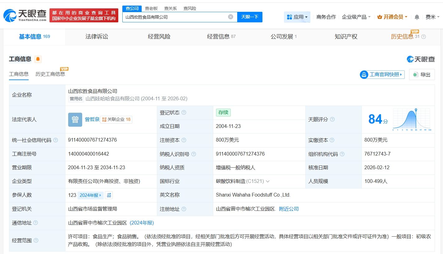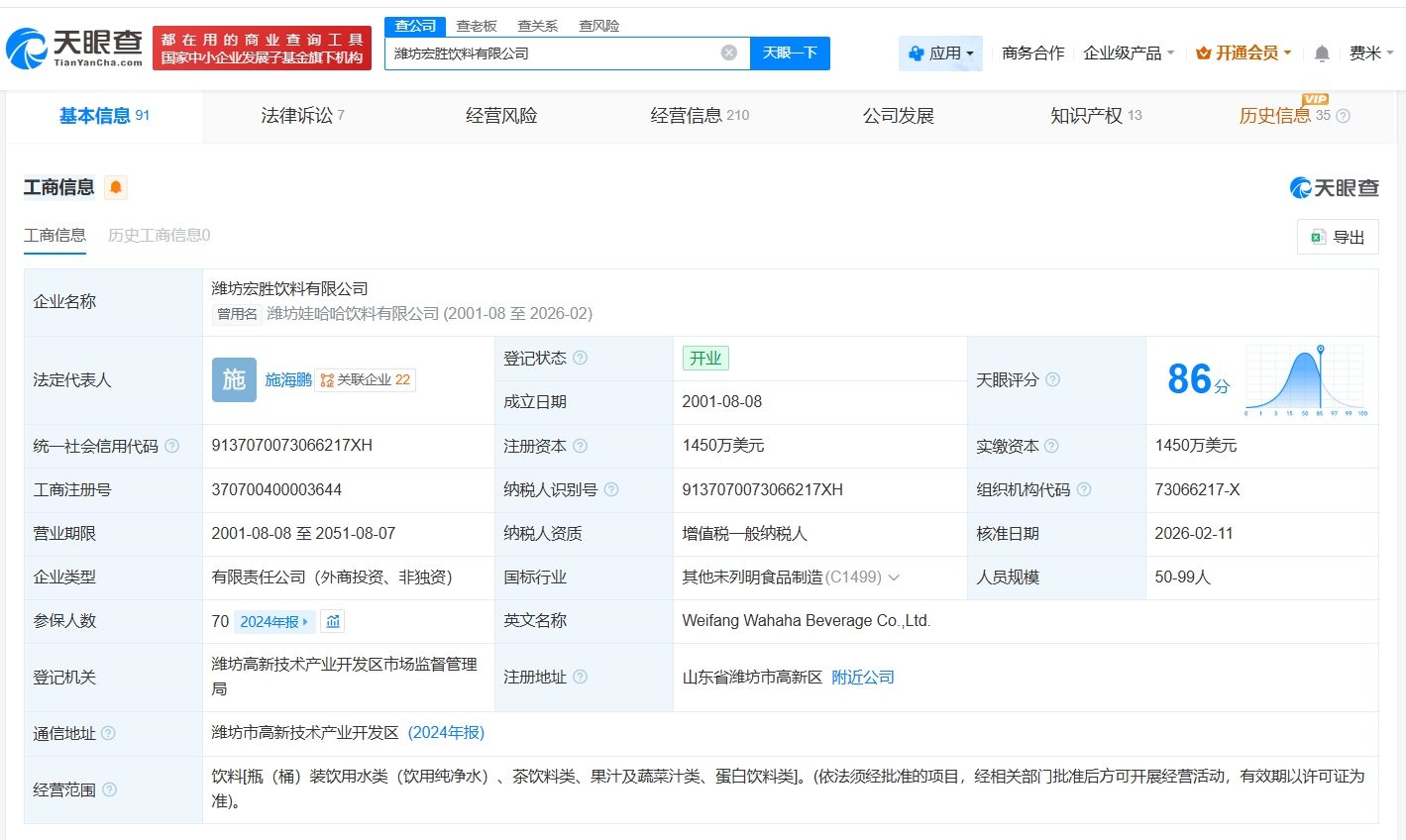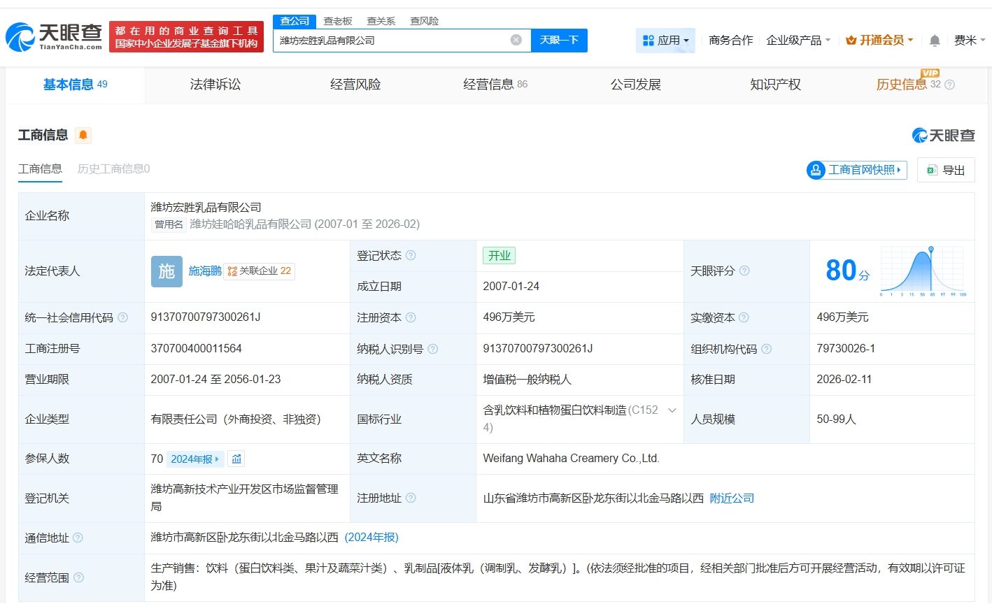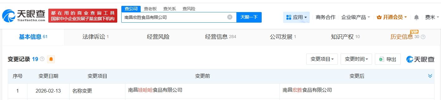 天眼查App显示,近日,南昌娃哈哈食品有限公司发生工商变更,企业名称变更为南昌宏胜食品有限公司。