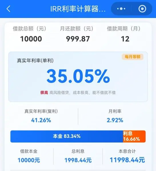 消费者张欣(化名)表示,她2025年从你我贷借款10000元,分12期,每期还款999.87元。表面看,一年的总利息是 1998.44 元,表面年化约 19.98%。但如果根据监管部门强制要求的 IRR(内部收益率)进行计算,由于采用等额本息还款,借款人实际占用的本金逐月递减,其真实的年化融资成本已飙升至35%。