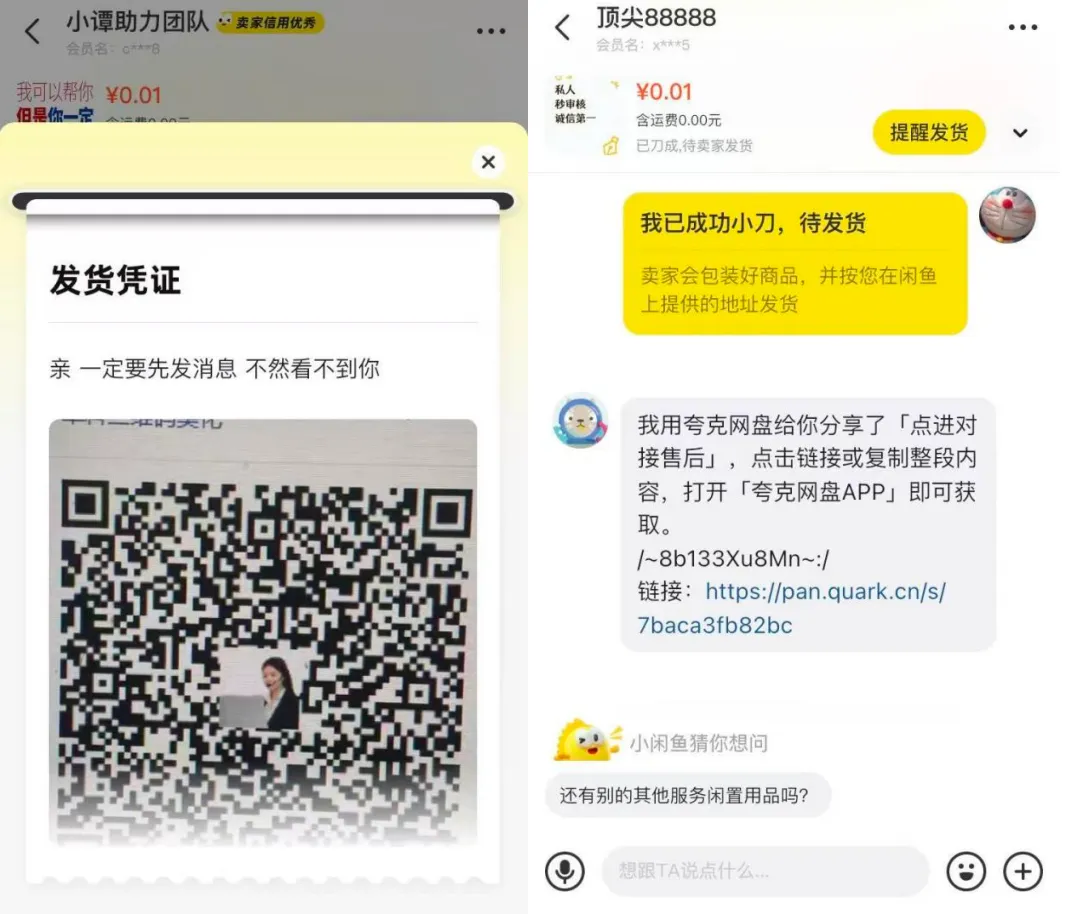 其中最主流的方式,是将买家引导至微信。部分卖家在闲鱼聊天界面一言不发,直接将微信二维码作为发货凭证上传,并在备注中提示买家尽快添加;同样是提供微信二维码,另一些卖家隐藏更深,他们发送夸克网盘的链接,买家需要跳转到夸克网盘APP中打开,才能获取二维码。