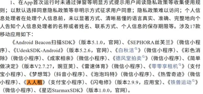 国家计算机病毒应急处理中心曾于2025年8月、2026年3月两次通报“人人租”APP及支付宝小程序存在违规问题,涉及隐私政策未明确信息收集范围、未提供便捷的撤回同意方式、以默认选择同意隐私政策等非明示方式征求用户同意、违规收集个人信息等。