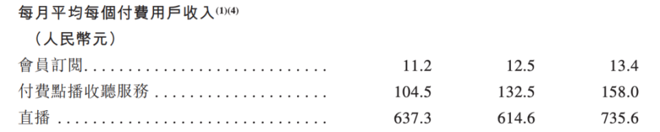 这中间无疑就产生了矛盾——从每月平均每个付费用户贡献的营收来看,直播是最高的,2021-2023年分别是637.3元、614.6元、735.6元,订阅会员是最低的,2021-2023年分别是11.2元、12.5元、13.4元。